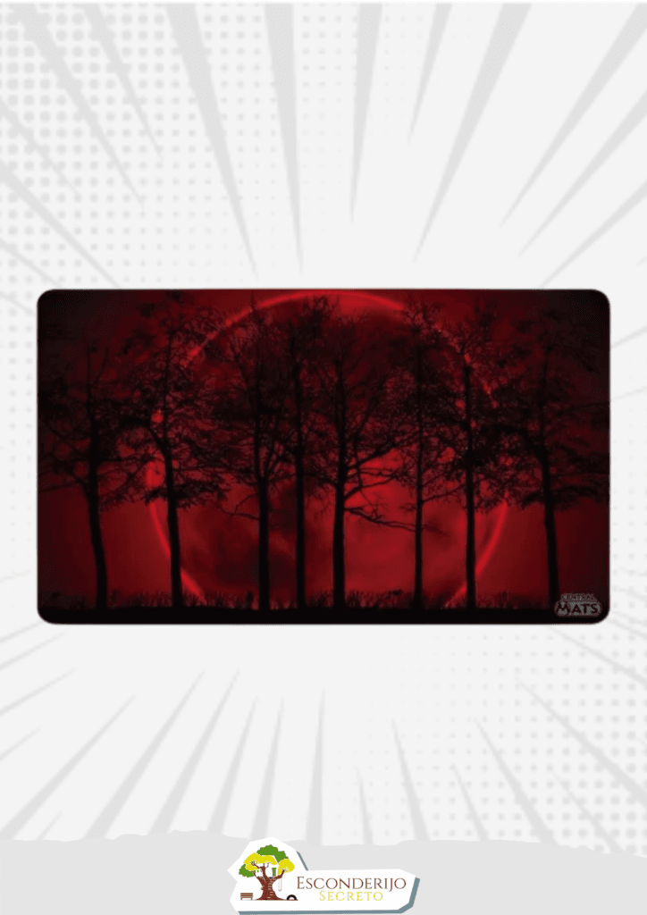 Playmat com arte Blood Moon. Tamanho 61cm x 35,5cm Espessura 2mm. Tecido de Poliéster emborrachado em um dos lados, para maior aderência. Material Profissional Excelente qualidade de impressão Lavável.
