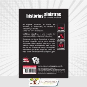 NOVIDADE: Pensando na ampliação da linha,teremos a total nacionalização do produto, localizando a marca “Black Stories” para “Histórias Sinistras”. Isso, porém, não altera em nada o conteúdo dos jogos ou as cartas. Devido a disponibilidade de estoque alguns envios podem ser feitos com o título Black Stories.