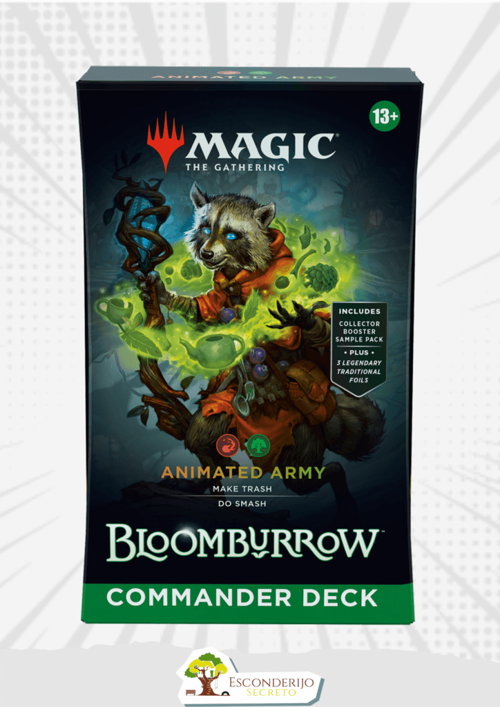 Enfrente seus amigos em batalhas multijogador épicas com um deck Vermelho-Verde pronto para jogar assim que sai da caixa. Este baralho animado de comandante do exército de Bloomburrow inclui 1 baralho de 100 cartas de Magic (3 cartas metalizadas tradicionais, 97 cartas não-foil), um pacote de amostra de booster de colecionador de 2 cartas (contém 1 carta tradicional foil ou não-foil de borda alternativa de raridade Rara ou superior e 1 Carta Incomum Foil Tradicional), 10 fichas de dupla face, 1 caixa de baralho (pode conter 100 cartas com protetores), 1 Roda da Vida, 1 encarte de estratégia e 1 carta de referência.
