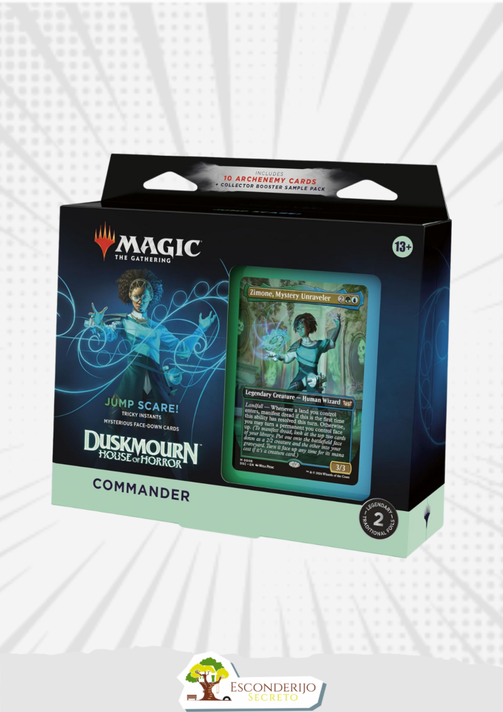 Lance o medo nos corações de seus oponentes com um baralho verde-azul que está pronto para jogar direto da caixa. This Duskmourn: House of Horror Jump Scare! O baralho Commander inclui 1 baralho de 100 cartas mágicas (98 cartas não metálicas e 2 cartas lendárias tradicionais sem bordas laminadas), 10 cartas Archenemy, um pacote de amostras de 2 cartas Collector Booster (contém 1 carta tradicional Foil ou nonfoil alt-border de raridade de raridade ou superior e 1 carta tradicional Foil Incomum), 10 fichas de dupla face, 1 caixa de baralho (pode conter Manga 100 cartões), 1 Life Wheel, 1 inserção de estratégia e 1 cartão de referência.