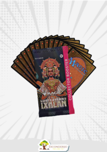 Ao desenterrar cada Collector Booster, você certamente encontrará Traditional Foils, Rares e/ou Mythics, e um card Universes Beyond Jurassic World Collection retratando personagens e momentos icônicos da franquia Jurassic World. Também não poupamos despesas com impressionantes cards alt-art, alt-border e tratamentos especiais exclusivos do Collector Booster. Cada The Lost Caverns of Ixalan Collector Booster contém 15 cards Magic: The Gathering e 1 ficha Traditional Foil dupla face, com 1 card Borderless Jurassic World (Rare ou Land), 5 cards de raridade Rare ou superior, 4 Uncommons, 4 Commons e 1 card Full-Art Showcase Land. Cada pacote contém um total de 10–13 cards Traditional Foil. Um card Cosmium Neon Ink pode ser encontrado em <1% dos Collector Boosters.