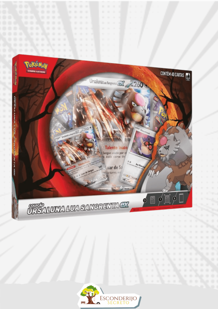 Ursaluna Lua Sangrenta vaga por florestas brumosas, atraindo Treinadores experientes em busca de aventura. Esse Pokémon das lendas aparece aqui como um Pokémon ex, acompanhado de seus parceiros noturnos Hoothoot e Noctowl, pronto para desferir seu Talento Inato já na próxima batalha!